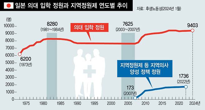 일본 의대 정원은 1970년대 초반부터 최근까지 크게 네 차례 변화가 있었다. 일본 정부는 1973년 최소한 ‘인구 10만명당 150명’의 의사가 필요하다며 이를 위해 의과대학이 없는 지방에 의대를 만드는 방식으로 정원 확대에 나섰다. 1973년 6200명이던 의대 정원은 1980년대 초반 8280명까지 2080명이 증가한다. 정원 확대를 이어가던 일본 정부는 1982년 이제는 ‘의사 과잉’ 우려가 있다며 점차 의대 정원을 축소하기로 결정했고, 2003~2007년엔 7625명까지 줄어든다.