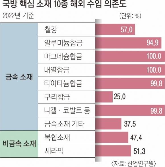 마그네슘합금과 내열합금의 수입의존도는 100%였다. 타이타늄합금과 니켈·코발트 등은 99.8%, 알루미늄 합금은 94.9%였다. 비금속 소재인 세라믹과 복합소재도 각각 51.3%와 47.4%를 수입에 의존했다.