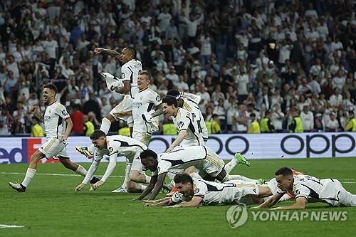 epa11328027 Players of Real Madrid celebrate winning the UEFA Champions League semifinal second leg soccer match between Real Madrid and Bayern Munich, in Madrid, Spain, 08 May 2024. EPA/JUANJO MARTIN
