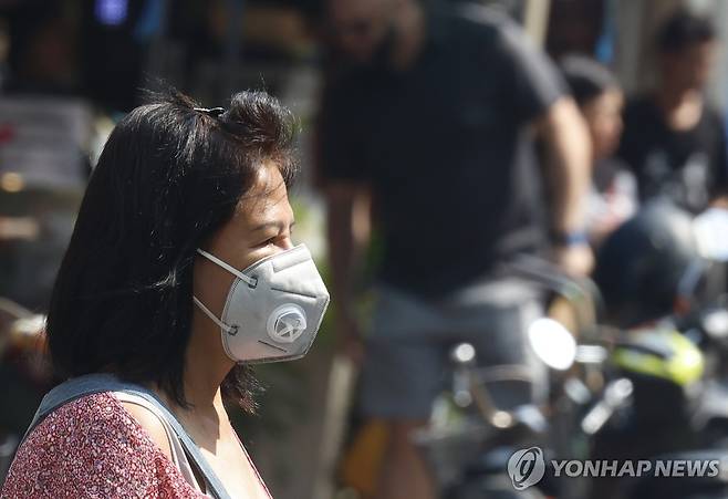 (방콕 EPA=연합뉴스) 8일(현지시간) 태국 방콕의 거리에서 한 여성이 섭씨 35도를 넘나드는 무더위에도 마스크를 쓰고 걸어가고 있다. 태국 보건당국은 최근 코로나19 감염 환자가 증가 추세라며 주의보를 내렸다. 2024.05.09