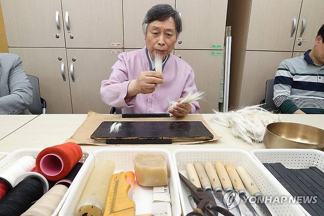 (서울=연합뉴스) 이재희 기자 = 서울시 무형문화재 제5호 전상규 필장이 9일 오후 서울 종로구 서울시무형문화재 교육전시장에서 백모필 제작 공개 시연을 하고 있다. 2024.5.9