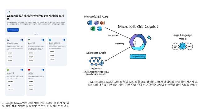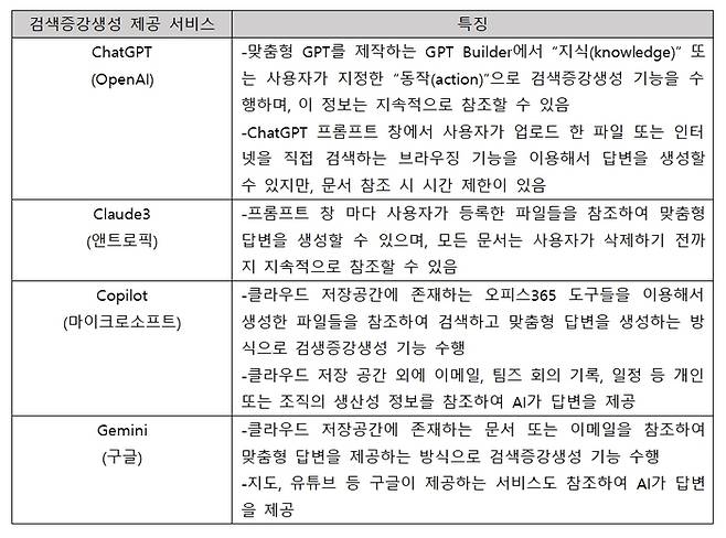 RAG 기술은 기본적으로 외부 정보를 참조해 응답을 생성한다는 점에서 공통점이 있지만, 언어모델 개발에 주력하는 기업과 클라우드 서비스를 제공하는 기업 간에 다소 접근법의 차이가 있다. 예를 들어, 챗GPT와 클로드(Claude)3는 사용자가 프롬프트 창에 등록한 문서 또는 이미지를 참조하는 방식인 반면, MS와 구글은 자사 클라우드 저장 공간의 파일과 연동된 생산성 도구 등을 광범위하게 활용한다. 어쩌면 스타트업과 빅테크 기업의 규모의 차이에서 비롯된 것일 수도 있지만, 사용자 입장에서는 크고 복잡한 서비스보다는 실제로 체감할 수 있는 스타트업의 최소 기능 제품을 더 자주 사용하게 되는 경향이 있다. 그러나 빅테크 기업들이 클라우드 저장공간과 생산성 도구들을 AI와 온전히 통합해 RAG 서비스를 완성하면 비즈니스와 개인의 일상에 막대한 영향을 미치게 될 것이다.