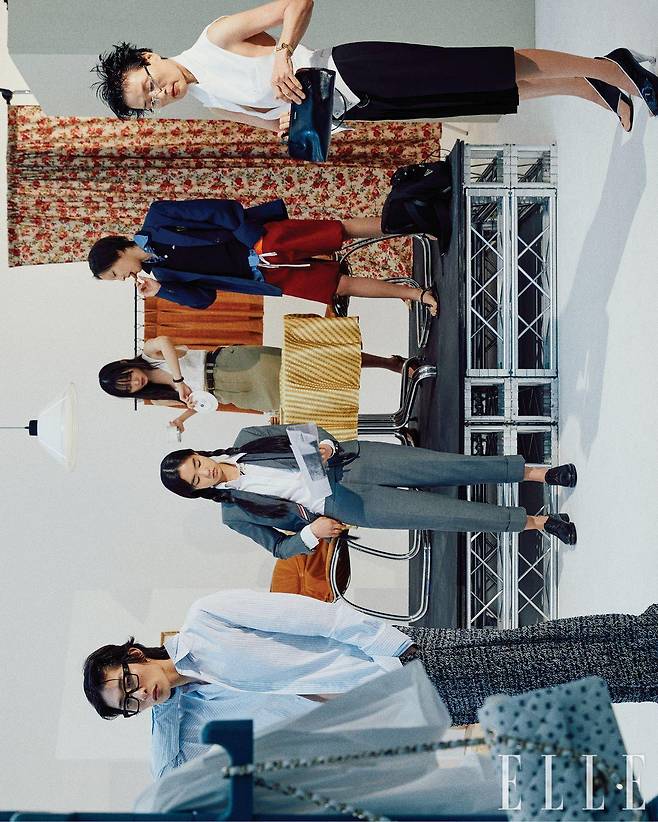 상현이 입은 셔츠는 가격 미정, 카나주 팬츠는 5백40만원, 모두 Dior Men. 사각 프레임의 안경은 52만4천원, Miu Miu by Essilor Luxottica. 메이가 입은 그레이 재킷과 화이트 옥스퍼드 셔츠, 팬츠, 넥타이, 로퍼는 가격 미정, 모두 Thom Browne. 서윤이 입은 탱크톱은 1백68만원, 펜슬 스커트는 2백84만원, 슈즈는 1백55만원, 모두 Saint Laurent by Anthony Vaccarello. 레더 벨트는 16만9천원, Polo Ralph Lauren. 블랙 스트랩 워치는 2백만원, Longines. 은무가 입은 네이비 재킷과 폴로 셔츠 톱, 체크 셔츠, 버건디 쇼츠와 브리프, 가죽 샌들은 가격 미정, 모두 Miu Miu. 리나일론 백팩은 가격 미정, Prada.우노 초이가 입은 화이트 베스트는 1백30만원, 플리츠스커트는 1백75만원, 모두 Tod’s. 놋 펌프스는 가격 미정, Louis Vuitton.안경은 가격 미정, Cartier.블랙 핸들 백은 가격 미정, Jil Sander. 핑크골드 케이스 워치는 5천4백만원, Jaeger-Lecoultre. 옷걸이에 걸린 프린트 체인 백은 가격 미정, Chanel. 화이트 셔츠는 가격 미정, Prada.