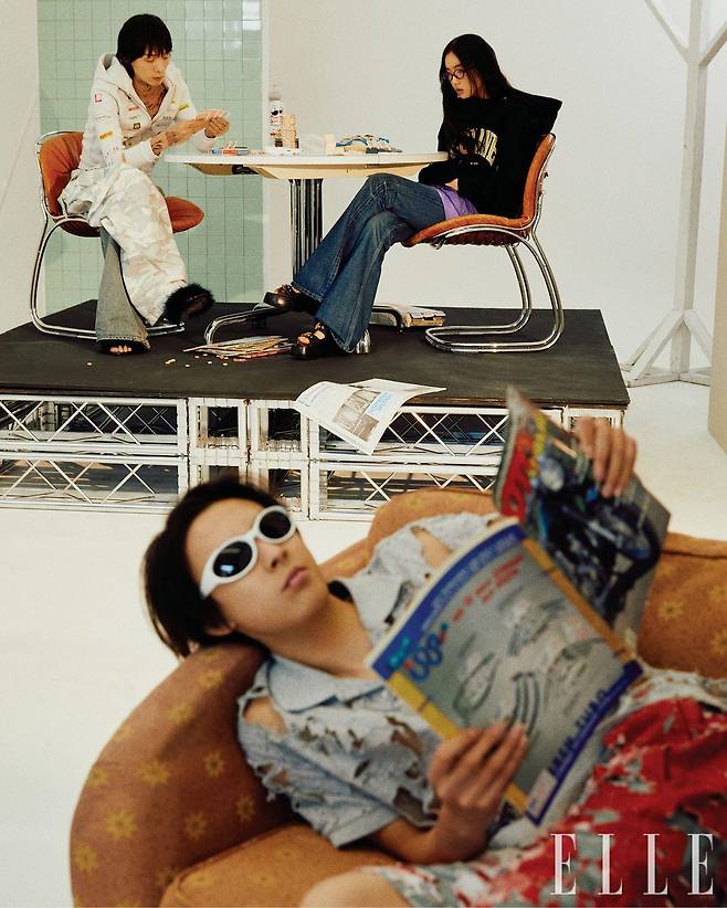 상현이 입은 아트워크 프린트 후디드 집업은 2백33만원, 타투 디테일의 톱은 1백49만원, 카모 하이브리드 배기 팬츠는 3백74만원, 깃털 샌들은 1백58만5천원, 모두 Balenciaga. 메이가 입은 오버사이즈 후디드 톱은 1백60만원, 워싱 데님 팬츠는 1백60만원, 모두 Celine by Hedi Slimane. 레이어드한 스커트는 가격 미정, Vivienne Westwood. 플랫폼 뮬은 85만원, Moschino. 안경은 51만1천원, Miu Miu by Essilor Luxottica. 은무가 입은 컷아웃 디테일의 톱과 팬츠는 가격 미정, 모두 Diesel.고글 셰이프의 선글라스는 42만원, Gentle Monster × Maison Margiela.