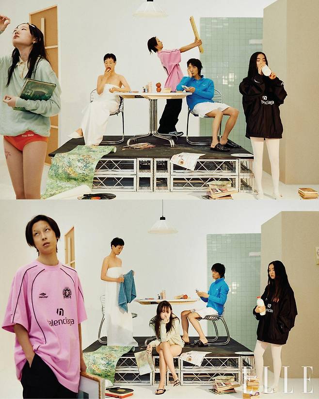 서윤이 입은 니트 톱과 이너 웨어 셔츠, 오렌지 브리프는 가격 미정, 모두 Miu Miu. 블랙 플립플롭은 가격 미정, Chanel. 우노 초이가 입은 화이트 롱 드레스와 슬리퍼는 가격 미정, 모두 The Row.무테 안경은 가격 미정, Cartier.은무가 입은 사커 티셔츠와 스니커즈는 가격 미정, 모두 Balenciaga. 블랙 팬츠는 가격 미정, Junn. J.상현이 입은 폴로 셔츠는 1백25만원, Dior Men. 코튼 쇼츠는 가격 미정, Prada. 블랙 뮬은 가격 미정, Bottega Veneta. 메이가 입은 사커 트랙수트 재킷은 3백66만원, Balenciaga.화이트 메리 제인 슈즈는 가격 미정, Chanel.