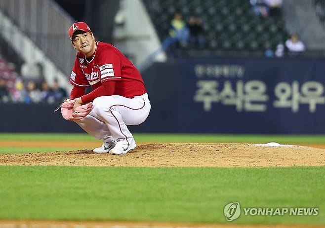 7회말 1사 만루 LG 박동원에게 밀어내기 볼넷을 내준 SSG 선발투수 김광현이 아쉬워하고 있다. 2024.5.9