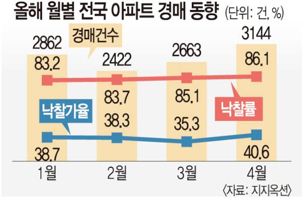 지지옥션이 9일 공개한 경매동향보고서를 보면 지난달 전국에서 진행된 아파트 경매는 3144건으로 전월 2663건보다 18.1% 늘었다.