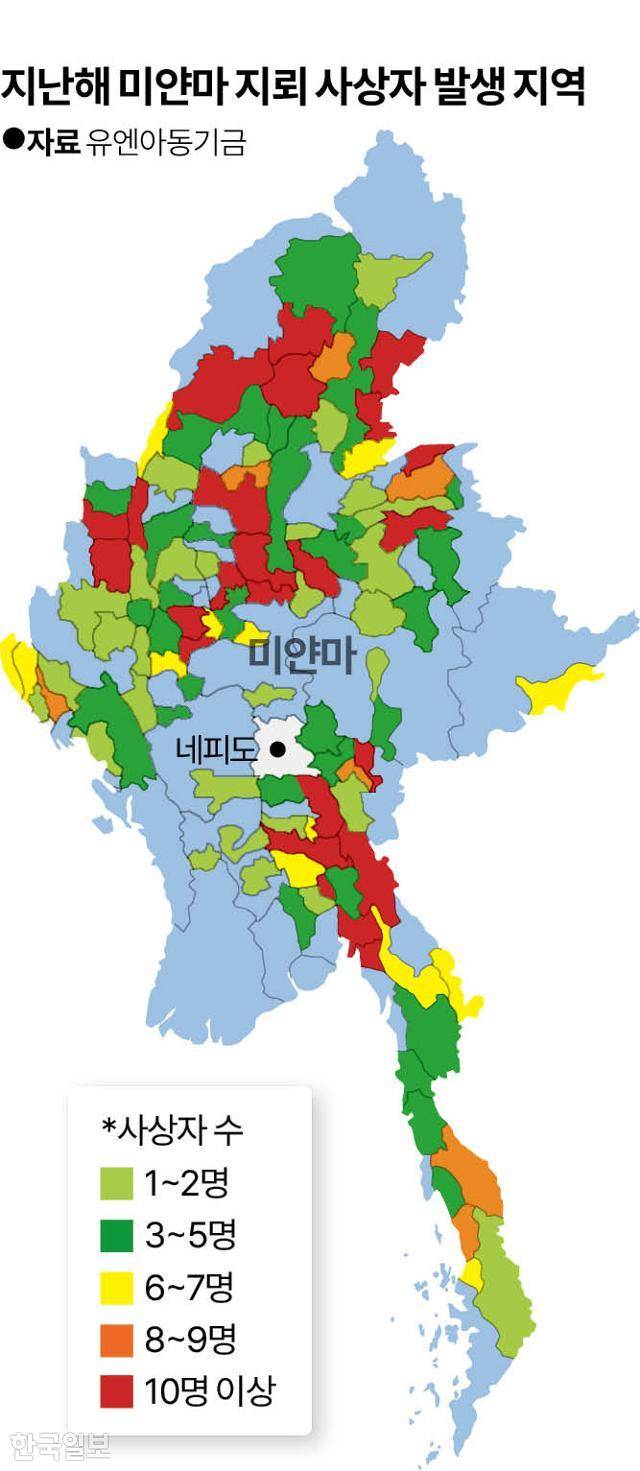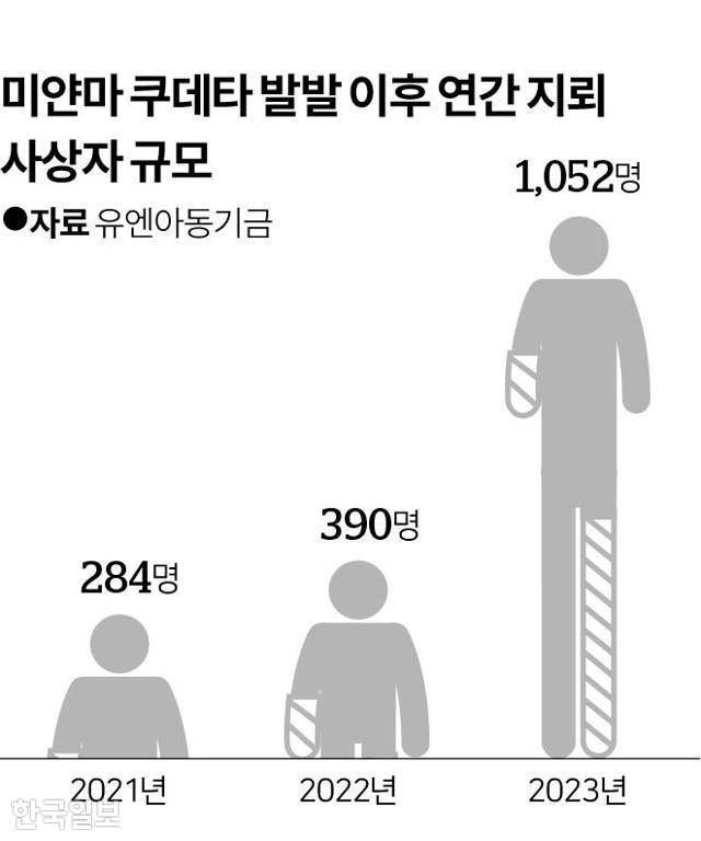 이 같은 분위기는 수치로도 확인할 수 있다. 쿠데타 발발 첫해와 2022년 각각 284명, 390명이던 지뢰 사상자 수는 지난해 1,052명으로 급증했다. 대부분 군부와 저항 세력 간 교전이 격화한 하반기에 발생했다. 피해자의 다섯 명 중 한 명(20%)은 어린이다.