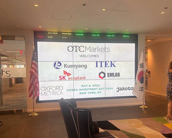 지난 8일(현지시간) 뉴욕 맨해튼의 OTC마켓 그룹 본사에서 열린 '코리아 인베스트먼트 데이' 행사장. 코스피 상장사인 금양과 비상장사인 SK 에코플랜트, SM랩의 투자 설명회가 열렸다. 행사에는 금양의 미국 주식예탁증서(ADR) 발행을 담당한 JP모건 관계자들과 현지 투자자 30여명이 참석했다.
