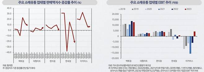 내수 산업 부진도 주시하고 있다. 고물가·고금리·고환율 등 이른바 '3고(高)' 현상으로 소매유통업 등 내수 산업이 부진하고 있다는 분석이다. 신세계그룹에 대해서는 “대형마트 영업규제, 국내외 이커머스 플랫폼의 전방위적인 시장침투, 국내 가계의 소비패턴 변화 등의 요인으로 신세계그룹 대형마트 부문의 경쟁력이 저하되는 추세”라며 “이마트의 G마켓·SCK컴퍼니(옛 스타벅스커피코리아) 지분 인수와 관련해 4조원가량의 자금 소요가 발행해 재무 부담이 커졌다”고 말했다.