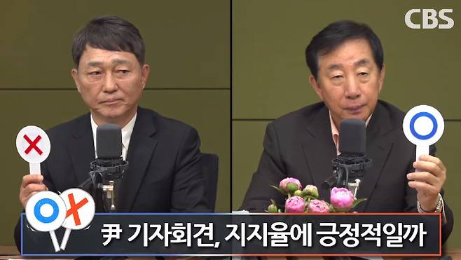 ◇ 김현정> 알겠습니다. 두 분이 하실 말씀 되게 많을 거예요. 오늘 퀴즈를 풀어가면서 어제 기자회견 얘기 남은 3년 얘기해보겠습니다. 청취자들을 위해서 OX는 음성으로도 좀 말씀해 주세요. 뉴스게임 출발하죠. 1번, 취임 2주년을 맞은 윤석열 대통령 어제 22개월 만에 기자회견을 했습니다. 질의응답 70분, 총 100분간 열린 기자회견 국민들은 어떻게 보셨을지 궁금한데요. 과연 다음 주 나올 대통령 지지율 반등할까요? 변화가 없을까요? 들어주십시오.