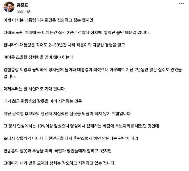 홍 시장은 전날 윤 대통령의 기자회견에 대해서도 "진솔하고 겸손했지만 그래도 국민 기대에 못 미치는 건 집권 2년간 검찰식 정치에 쌓였던 불만 때문일 것"이라고 진단했습니다.