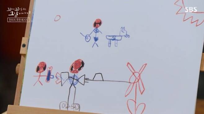 우리가 서준이의 사연을 알기에, 이런 해석이 나왔다고 생각할 수도 있지? 그래서 아이가 남긴 그림 두 장이 더 있어. 이걸 '꼬꼬무'에서 분석을 의뢰했어. 아무런 배경 정보 없이, 만 5살 남자 아이가 그렸다는 사실만 전달했어. 그런데, 전문가들의 분석은 완전 소름이었어.