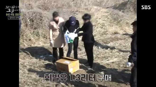 안 씨는 논 가장자리에 있는 폐드럼통을 발견하고는, 거기에 상자를 밀어 넣어. 그리고 주유소로 향했어. 휘발유 1.3리터를 사서 다시 돌아왔어. 그리고 라이터로 불을 붙였어. 안 씨는 그렇게 서준이를 두 번 죽인 거야.