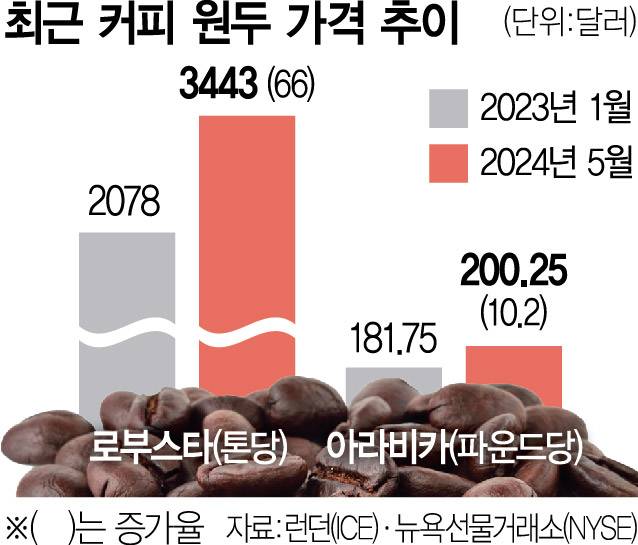게다가 최근 원두·우유·코코아 등 주요 원재료 가격까지 줄줄이 오른 점도 치명적으로 작용했다. 런던 국제선물거래소에서 로부스타 원두 가격은 지난해 1월 초 기준 톤당 2078달러에서 이달 초 3443달러로 약 66% 치솟았다. 로부스타 원두와 함께 커피 시장의 양대 품종 중 하나인 아라비카 원두 역시 뉴욕선물거래소에서 같은 기간 가격이 10.2% 올랐다. 이 밖에 트레이딩이코노믹스에 따르면 국제 선물 시장에서 코코아 가격은 연초 대비 154.2%, 우유는 14.5% 상승한 것으로 나타났다.