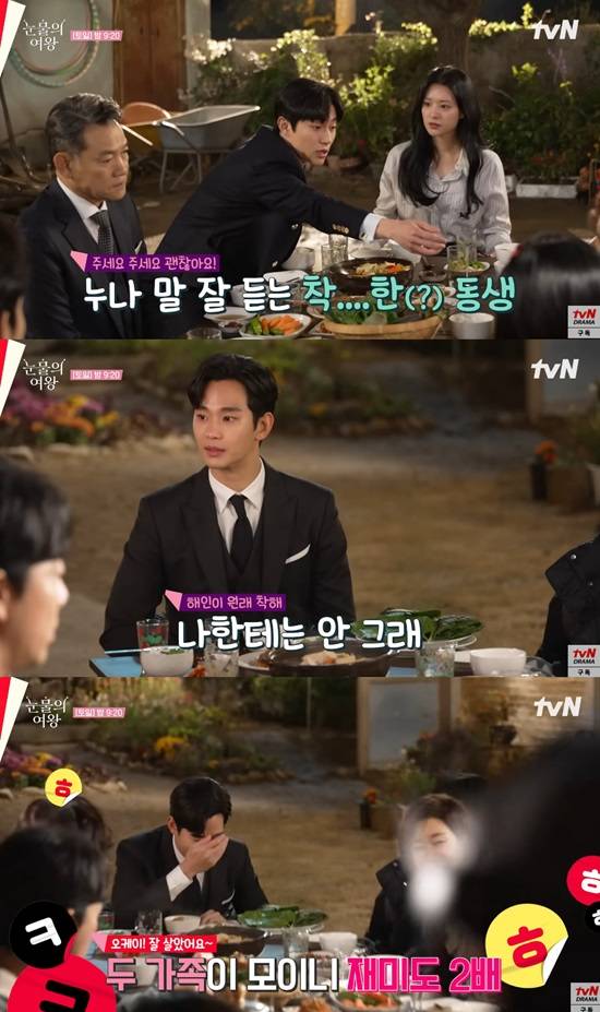 또한 김수현은 '눈물의 여왕' 도중 남동생 홍수찬(곽동연 분)을 때리며 구박하는 아내 홍해인(김지원)을 촬영하는 도중 "나한테는 안 그래"라며 자신의 가족을 안심시키는 부분이 애드리브였다는 사실이 밝혀져 그의 센스가 더욱 화제가 된 바 있다.
