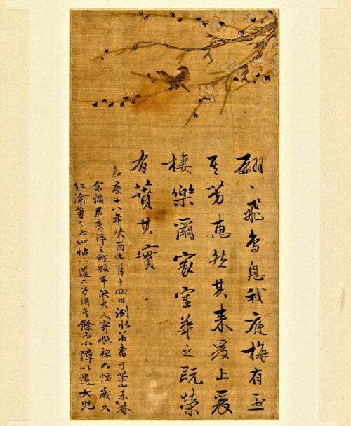 | ▲ 다산이 유배지에서 시집가는 딸에게 그려준 ‘매화병제도’. 두 마리 새처럼 다복한 가정을 꾸리고 행복하게 살라는 아버지의 마음을 담았다. 가로로 길게 시를 쓰고 옆에 그림을 그린 사연을 적었다. 내용은 하피첩의 서문과 비슷하다 |