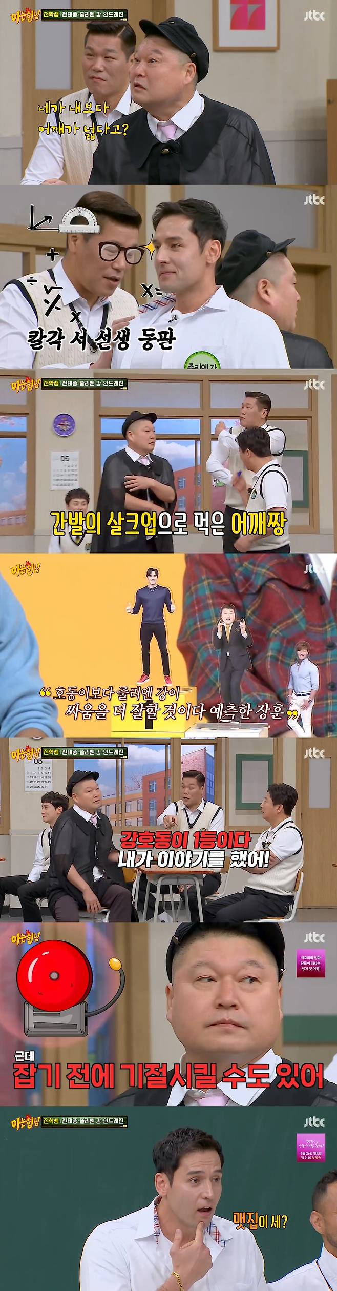 하지만 강호동은 "줄리엔 강은 얼굴이 작지 않냐. 그러니까 어깨가 넓어 보이는 거다. 난 얼굴이 큰데 (어깨가 넓어 보이니까) 진짜 어깨가 넓은 거다"라고 맞섰다.