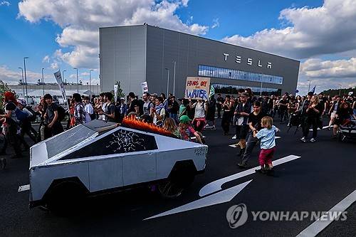 epa11333480 Environmental activists take part in a protest against Tesla's plans to extend its Gigafactory plant, in Gruenheide, near Berlin, Germany, 11 May 2024. Due to the ongoing protests, Tesla announced earlier this week it would suspend production at its factory in Gruenheide on 10 May for one day. EPA/FILIP SINGER