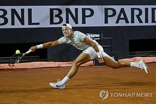 epa11333949 Holger Rune of Denmark in action against Luca Nardi of Italy (not pictured) during their men's singles match at the Italian Open tennis tournament in Rome, Italy, 11 May 2024. EPA/ALESSANDRO DI MEO