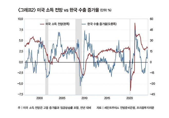 이제 한국 주택시장으로 시선을 돌려보자. 한국 수출 기업은 미국 가계소득 전망이 개선될 때 긍정적 영향을 받을 가능성이 크다(그래프2 참조). 주택을 구입할 정도로 미래를 낙관하는 근로자가 스마트폰과 가전제품, 자동차를 추가로 구입하지 않을 이유가 없기 때문이다. 특히 한국 기업은 이 부문에서 매우 강한 경쟁력을 가지고 있다는 것도 영향을 미친다.