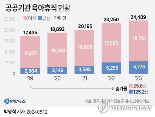 공공기관의 육아휴직자는 2019년 1만7천435명, 2020년 1만8천892명, 2021년 2만195명, 2022년 2만3천250명 등으로 꾸준한 증가세다.