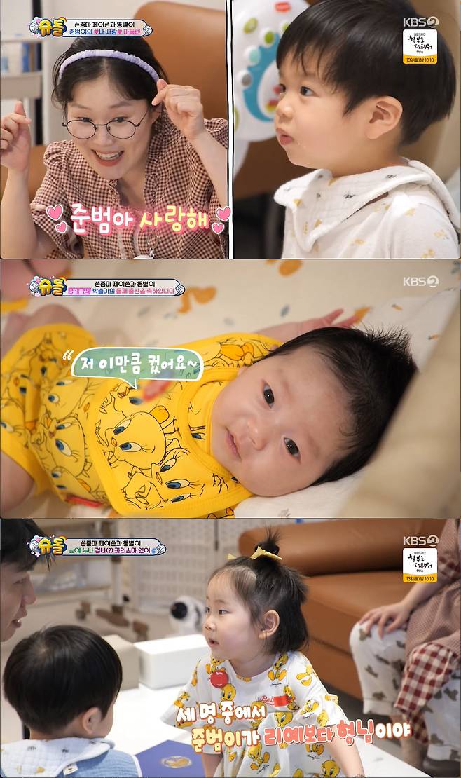 "이제 이 여유를 가지고 둘째 진행해라"라는 박슬기에 제이쓴은 "쉽지 않다"며 고개를 저었다. 그때 준범이는 아빠가 어딨는지 두리번대며 찾았고 제이쓴은 급하게 리예를 내려놓고 준범이에게 폭풍 칭찬을 했다.