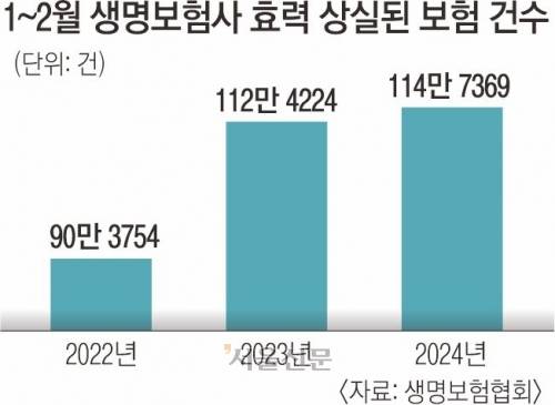 12일 생명보험협회에 따르면 22개 생명보험사에서 지난 1~2월 두 달 동안 고객이 해약하거나 효력이 상실된 보험은 114만 7369건으로 집계됐다. 효력상실은 가입자가 보험료를 몇 달씩 내지 못한 보험 계약이 깨지는 것으로, 비자발적인 보험 해지를 뜻한다. 보험 효력상실 및 해약은 2022년 같은 기간(1~2월) 90만 3754건, 지난해 같은 기간 112만 4224건으로, 3년째 증가하는 추세다.