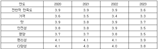 요소별 만족도를 보면 편리성이 3.9점으로 가장 높고 다양성(3.8점), 맛(3.7점), 안전성(3.5점), 영양(3.5점)에 이어 가격이 3.3점으로 꼴찌였다.