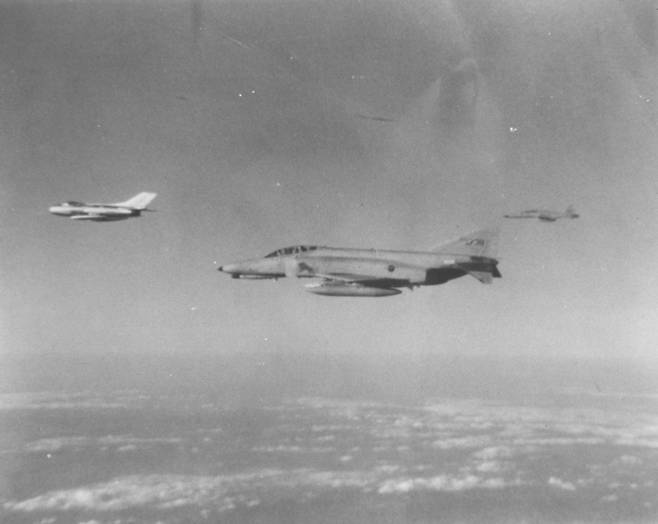 귀순한 北 MiG-19기 유도하는 F-4 공군 F-4E 팬텀 전투기가 1983년 2월25일 서해 연평도 상공을 통해 귀순하는 북한 공군 리웅평 대위가 탄 MiG-19기를 수원 기지로 안전하게 유도하고 있다. F-4 팬텀은 1969년 우리나라에 처음 도입된 후 55년간 대한민국 영공을 수호하고 다양한 작전에 투입됐다. 공군 제공