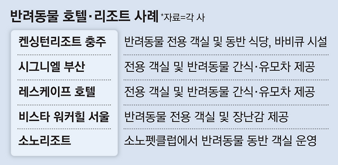 주요 호텔과 리조트들은 반려동물 전용 침대나 배변패드, 식기 등을 갖춘 동반 투숙 객실은 물론, 동반 뷔페나 애견 유모차 대여 서비스까지 세심하게 마련하는 추세다.