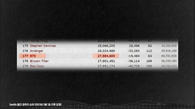 전 세계에 한 5억 명 정도가 쓰고 있다고 하는 스포티파이라고 하는 플랫폼에서 월간 청취자 수가 나오는데 1,000위, 2,000위까지 통계를 뽑아주는 사이트가 있거든요. 제가 거기 들어가서 인기 있는 모든 K-POP 그룹들을 검색해봤죠. 근데 순위가 가장 높은 게 BTS, 제가 약 한 달 전쯤에 봤을 때 한 177위권이었고 블랙핑크가 422위권 정도 됐었어요.* 그리고 테일러 스위프트를 꺾고 가장 많이 음반을 판 세븐틴 같은 경우에는 1,000위권 밖에 있었거든요, 1,659위.
