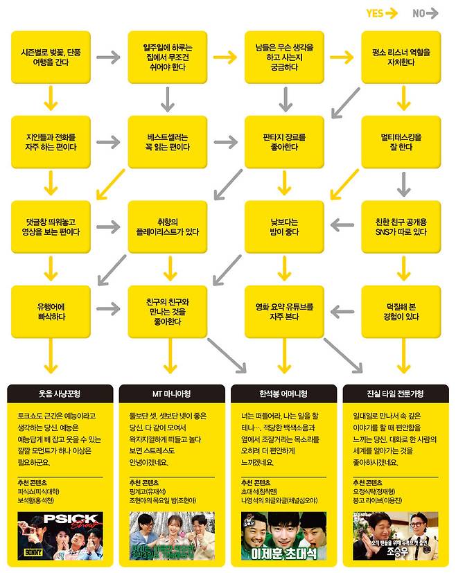 범람하는 유튜브 토크쇼, 인기가 많다고 해서 봤는데 딱히 재미도 없고 거기서 거기인 것만 같다면? 토크쇼에도 장르가 있다는 사실을 잊지 말자. 예능형, 대화형, 왁자지껄형 등등 무수한 갈래 속에서 당신의 취향을 아직 찾지 못했을지도 모른다. 유튜브 토크쇼에 영 재미를 못 느꼈다면 테스트를 통해 취향에 맞는 토크쇼를 파악하고, 한 번만 더 시도해보는 것은 어떨까.