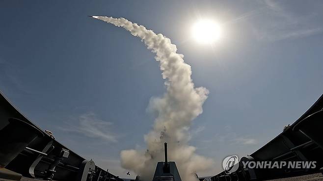 (서울=연합뉴스) 지난 10일 동해 해상에서 실시한 합동 전투탄 실사격 훈련에서 춘천함(FFG-II)이 적 항공기 및 유도탄을 모사한 대공무인표적기에 해궁 대함유도탄방어유도탄을 발사하고 있다. 2024.5.13 [해군 제공. 재판매 및 DB 금지]