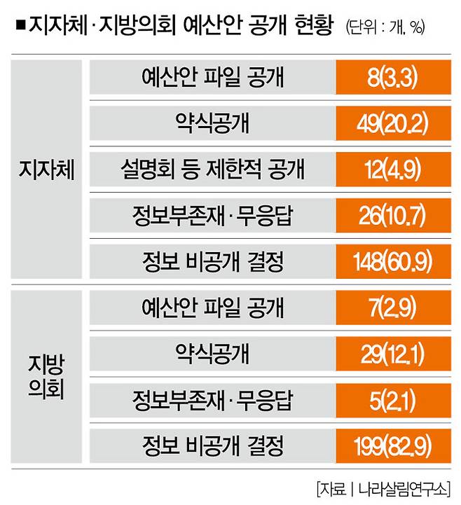 나라살림연구소는 올해 1월 전국 243개 지자체를 대상으로 2024년도 예산안(사업예산안과 기금운용계획안)을 정보공개청구했다. 기한은 지방의회가 예산안을 심의하기 전까지였다. 240개 지방의회에도 상임위원회 심사 전인 예산안을 공개해 달라고 요청했다.