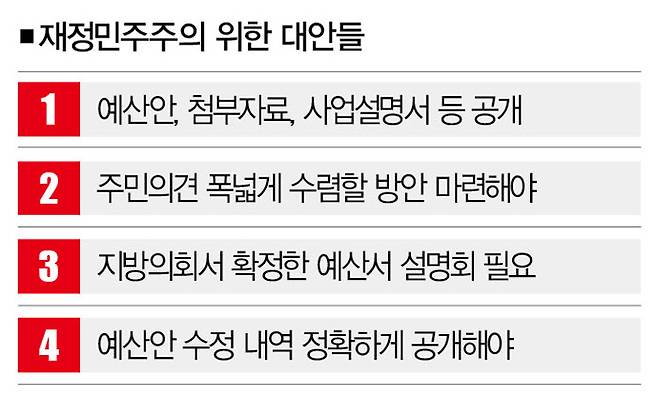 이런 맥락에서 우리가 추구하는 재정민주주의의 손볼 점은 명확하다. 첫째, 주민의 알권리와 재정투명성 실현을 위해 지자체 예산안을 전면적으로 공개하는 게 최우선이다. 둘째, 설명회나 토론회, 설문조사 등 주민의 의견을 폭넓게 수렴할 방안을 마련해야 한다.