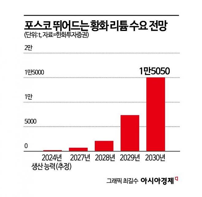 포스코의 황화 리튬 생산이 주목받는 건 대규모 양산으로 가격을 낮출 여지가 커졌기 때문이다. 현재 황화 리튬 가격은 ㎏당 1500~2000달러 수준으로, 같은 무게의 기존 액체전해질 가격 9달러 대비 최소 160배 이상으로 높다. 현재 국내에선 레이크머티리얼즈, 이수스페셜티케미칼, 정석케미칼 등이 황화리튬을 생산하고 있다. 한화투자증권의 추정에 따르면 이 업체들의 합산 생산 능력은 현재 약 200t으로 추정된다. 반면 2030년 수요량은 1만5000t을 웃돌 것으로 보인다.