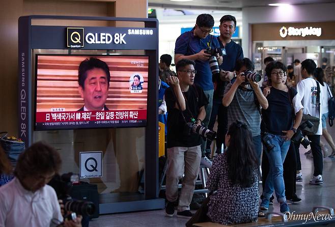 | ▲ 2019년 8월 2일 서울역에서 일본이 무역 '화이트리스트'에서 한국을 제외하는 내용의 뉴스가 방송되고 있다. |