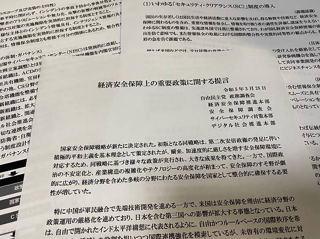 | ▲ 2023년 4월 4일 자민당 정책조사회가 작성해 기시다 후미오 총리와 다카이치 사나에 경제안보상에 제출한 '경제안전보장상의 중요정책에 관한 제언서' |