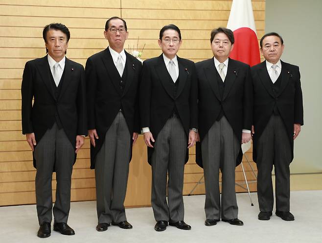 | ▲ 2023년 12월 14일 일본 도쿄 총리 관저에서 기시다 후미오 일본 총리(가운데)가 새롭게 임명된 각료 4명과 기념 촬영을 하고 있다. 왼쪽부터 사이토 겐 경제산업상, 마쓰모토 다케아키 총무상, 기시다 총리, 하야시 요시마사 관방장관, 사카모토 데쓰시 농림수산상. |