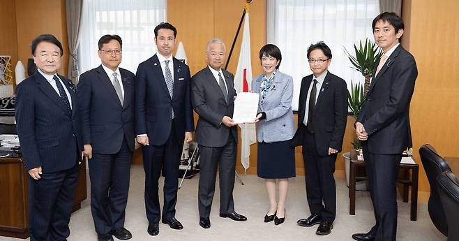 | ▲ 2023년 4월 4일 경제안전보장상의 중요정책에 관한 제언서를 건네받는 다카이치 사나에 경제안보상(오른쪽에서 세번째). 현재 일본 경제안보법의 주요 제도 및 법령은 이 제언서에 따라 차근차근 제정되고 있다. |