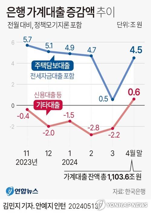 (서울=연합뉴스) 김민지 기자 = 한국은행이 13일 발표한 '금융시장 동향'에 따르면 4월 말 기준 예금은행의 가계대출(정책모기지론 포함) 잔액은 1천103조6천억원으로 한 달 전보다 5조1천억원 늘었다.