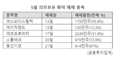 최대주주가 보유한 물량도 예외가 아니다. 자금이 필요한 경우 주식 일부를 언제든 매도할 수 있다. 코스피시장의 동인기연은 최대주주가 보유한 414만주가 오는 21일 보호예수에서 해제된다. 전체 상장주식 수(612만주)의 67.7%에 해당한다. 코스닥시장의 스톰테크는 전체 상장주식의 72.9%(979만주)에 달하는 최대주주 보유물량의 락업이 20일 해제된다.