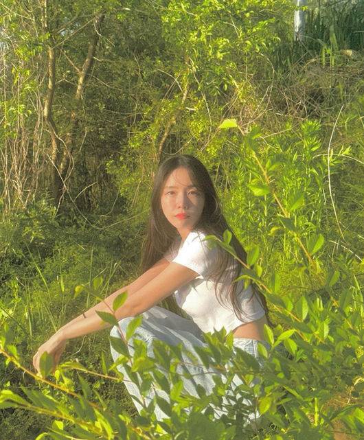 공개된 사진 속에서 방민아는 청바지에 흰색 크롭 티셔츠를 입고 긴 머리를 풀고 카메라를 응시하고 있다.
