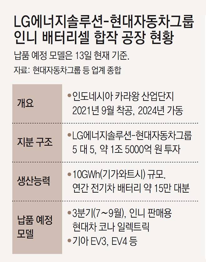 LG에너지솔루션과 현대차그룹이 지분 절반씩을 가진 HLI그린파워는 인도네시아 공장을 2021년 9월 착공했고 올해부터 양산에 돌입한다.