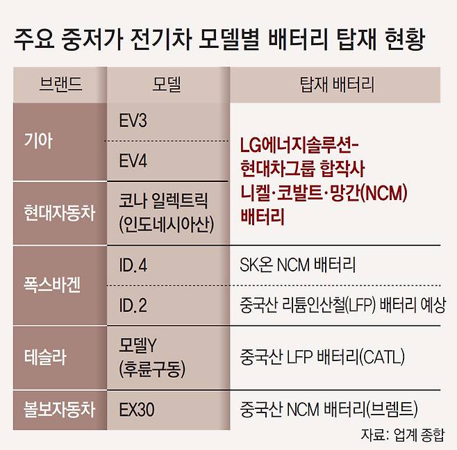 그동안 중저가 전기차 모델의 경우 중국산 배터리에 크게 의존해 오던 현대차그룹의 배터리 공급망도 다양해질 것으로 보인다. 지금까지 판매가가 2000만 원대인 기아 레이 EV에는 중국 CATL의 리튬인산철(LFP) 배터리가, 각각 시작가 4855만 원과 4352만 원인 기아 니로EV와 현대차 코나 일렉트릭(국내)에는 CATL의 NCM 배터리가 탑재된 것으로 알려졌다.