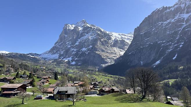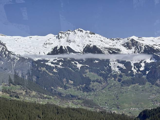 이날 설산의 순백과 초원의 초록, 하늘색 하늘은 마르지 않은 물감처럼 생생하게 빛났다. 청정한 자연에서 우러나는 맑고 높은 채도. 단순히 바라보는 것 만으로도 마음이 시원해지는 색감. 천국을 엿본다면 이런 색일지도 모른다. 초원 위에 별처럼 흩뿌린 듯한 오래된 나무집과 나른하게 풀 뜯는 얼룩소들, 뾰족한 나팔 모양 종탑과 빨간색 나무 덧창들. 움직이는 기차 안에서 우릴 스친 모든 풍경이 다정하고 아름다웠다.