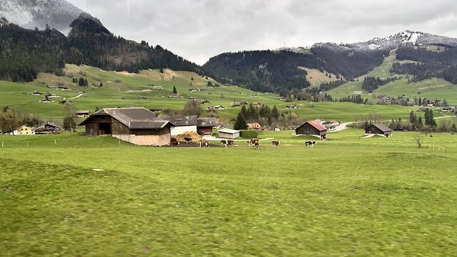 오후 2시 넘어 몽트뢰(Montreux)에서 출발한 열차는 지금 알프스 중산간 마을을 가로지르는 중이다. 집들은 목장인지 주택인지 알 수 없을 정도로 드문 드문해졌다. 종종 양을 치며 산책하는 어린 목동들도 눈에 띈다. 평온하고 목가적인, 스위스하면 떠오르는 전형적인 풍경이다. 참 신기하다. 스위스에선 어떻게 여전히 저런 '목동'의 삶이 가능한걸까. 그런데도 이 나라의 국민 소득이 세계 1위라니 놀라울 따름이다.