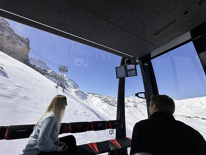 우린 먼저 인터라켄 오스트역에서 베르너 오버란트 열차를 타고 그린델발트 터미널역에 내렸다. 여기서 아이거글렛쳐역으로 가는 케이블카 '아이거 익스프레스(Eiger Express)'를 탔다. 2020년 개통된 최신식 케이블카 아이거 익스프레스는 단 15분 만에 고도차 1,200m를 연결한다. 이 15분은 마법과도 같은 시간이다. 통유리창 밖으로 처음엔 봄기운 완연한 푸른 들판이 펼쳐지더니, 산허리를 지나 실구름을 위로 올라가고 어느새 사방이 눈으로 뒤덮인 겨울 왕국으로 바뀐다. 아마 엘사도 이런 마법은 부리지는 못할 것 같다.