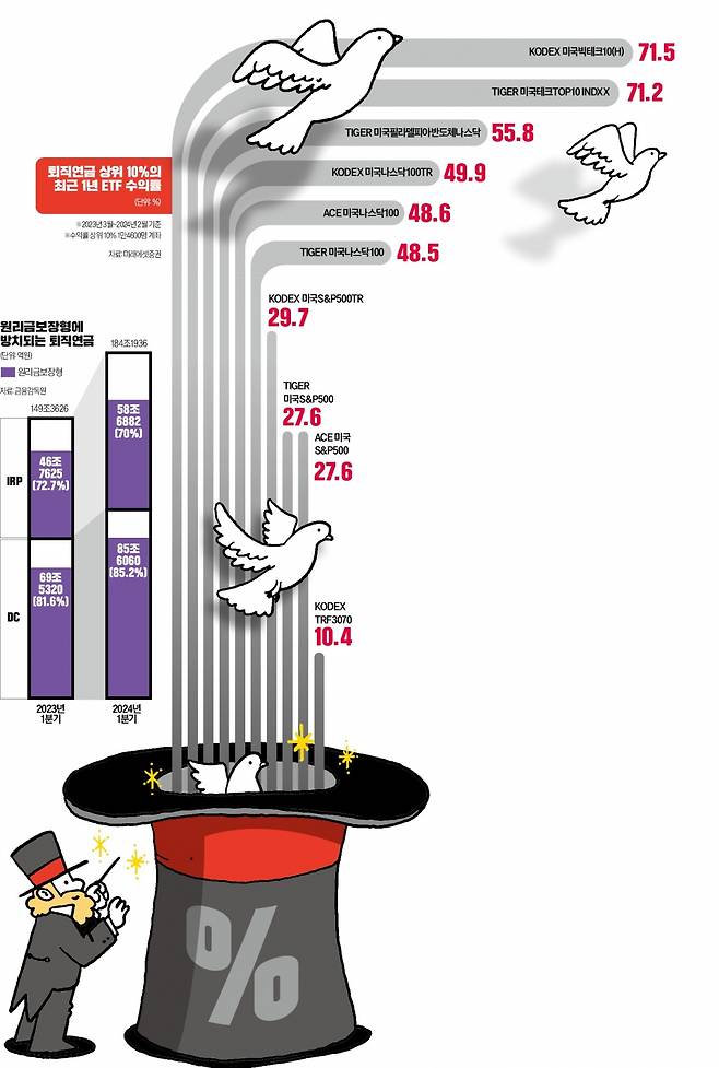 연금고수들이 가장 많이 보유한 상품은 미국 나스닥100지수를 추종하는 ‘TIGER 미국나스닥100’이었습니다. 1년 수익률만 48.5%에 달했습니다. 이외에도 ‘TIGER 미국S&P500’, ‘KODEX 미국나스닥100TR’등 미국 지수형 상품에 투자가 집중된 것으로 나타났습니다. 수익률이 가장 좋았던 상품은 ‘KODEX 미국빅테크10(H)’(71.5%)과 ‘TIGER 미국테크TOP10 INDXX’(71.2%) 등 미국 기술주 ETF였습니다.